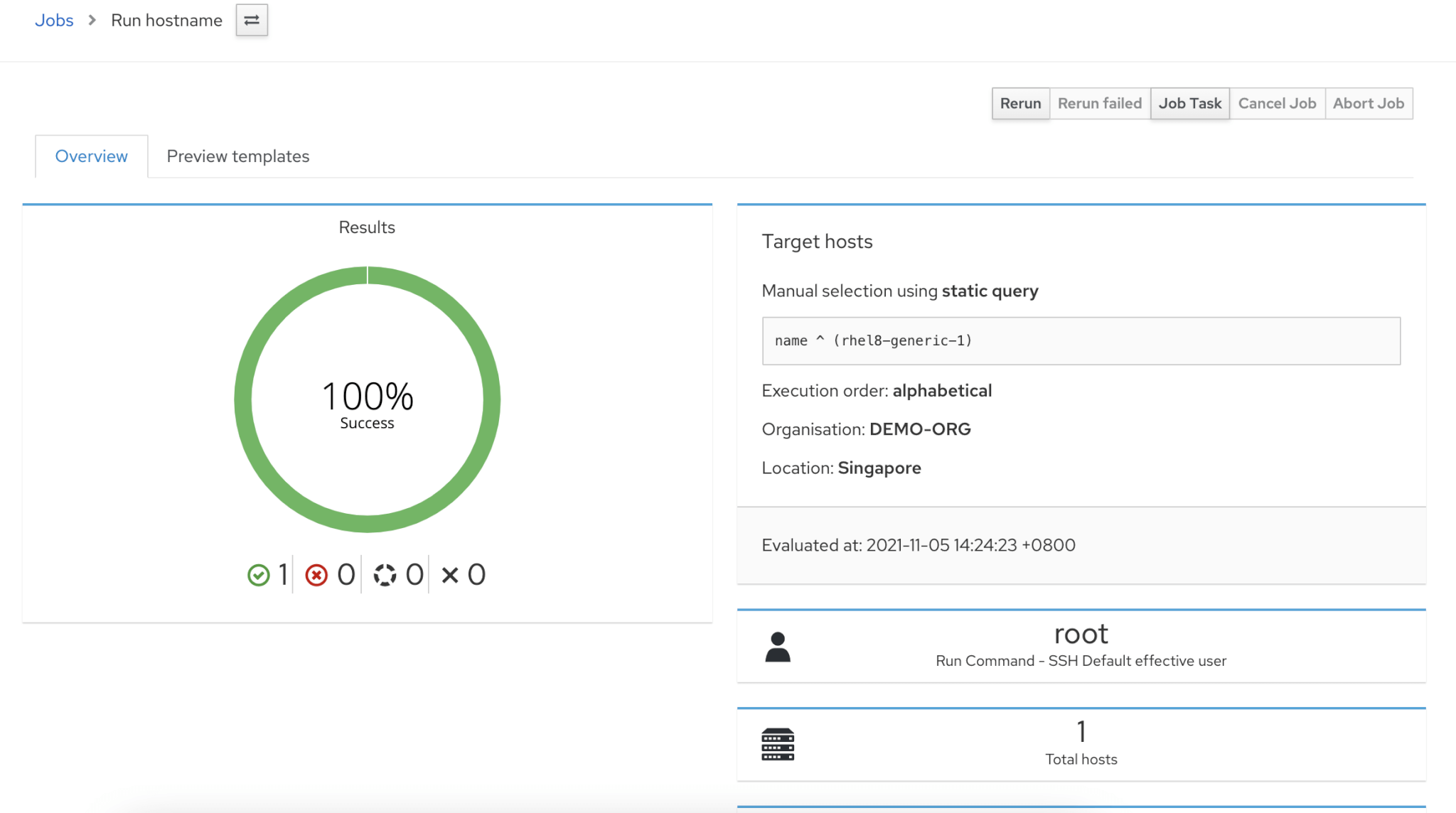 If you want to see details of job, then scroll down and select the host to find job output.