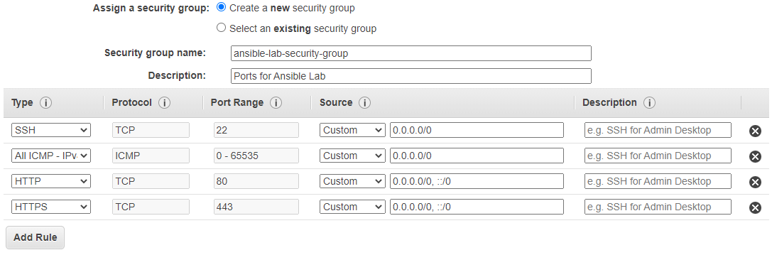 lab = Ansible(Optional but best practice) - Step 6 – Configure Security Group : Select option Create a new Security Group and add below ports to allow. (If you have any existing SG with those ports opened, you can use that as well)