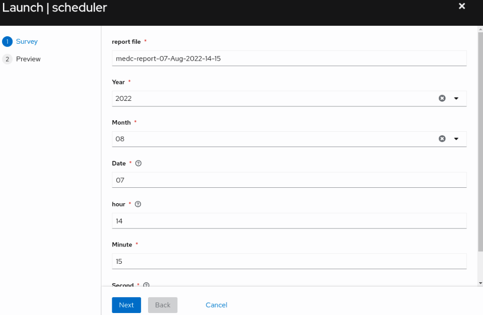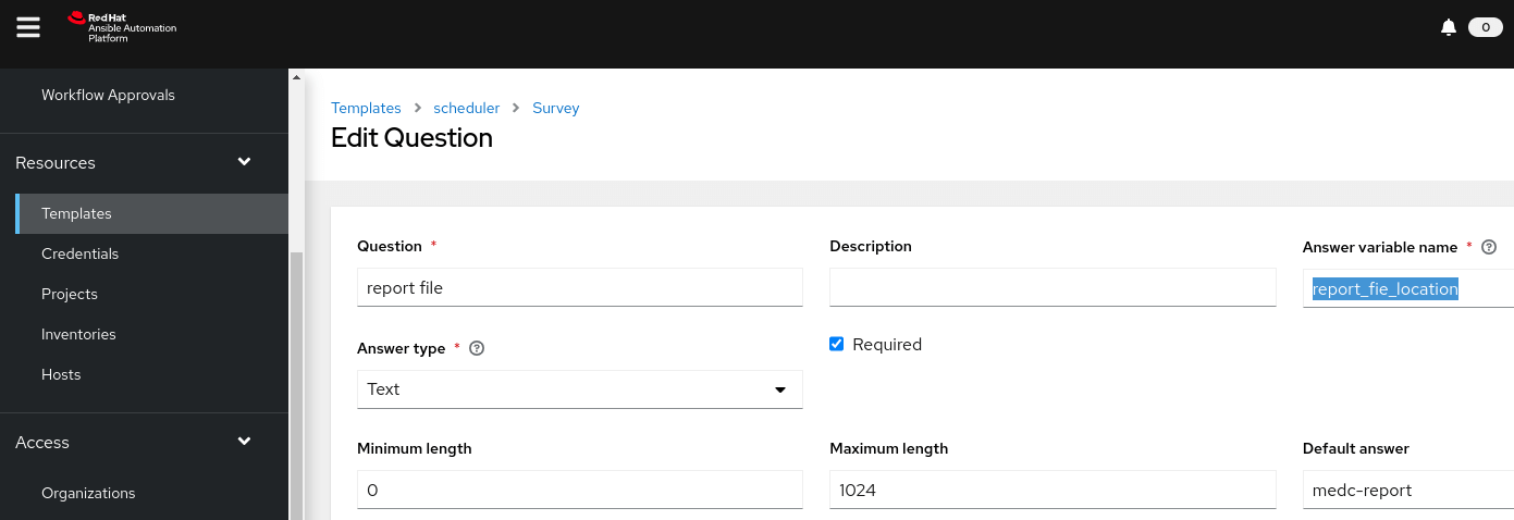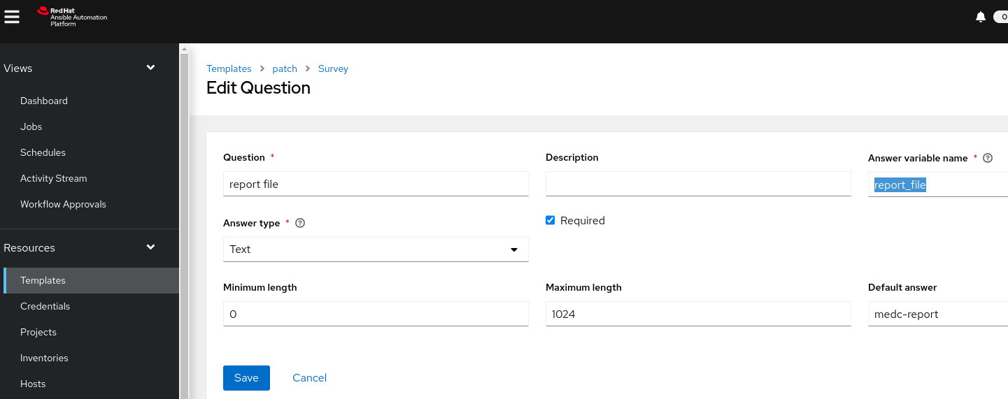 The value of “report_fie_location” will be passed to the playbook “patch.yaml”. The other parameters will be consumed by the playbook “schedule.yaml”.