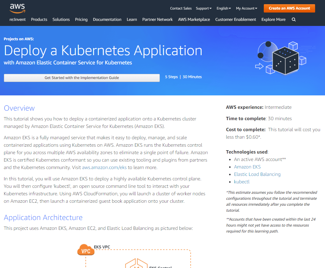 Let’s try the tutorial called Deploy a Kubernetes Application. Click on the tutorial and it will load with a page where you can see the overview of the hands-on tutorial you are going to do. Also you can see the details like architecture, technologies you are going to use etc. On the right side you will see details like approximate time needed for this hands-on, the level of complexity and also an approximate cost for this experiment. I think I missed to mention that, you need an AWS account to do this experiment but you can easily sign-up for a FREE trial and which is more than enough to do all these tutorials; most of them.