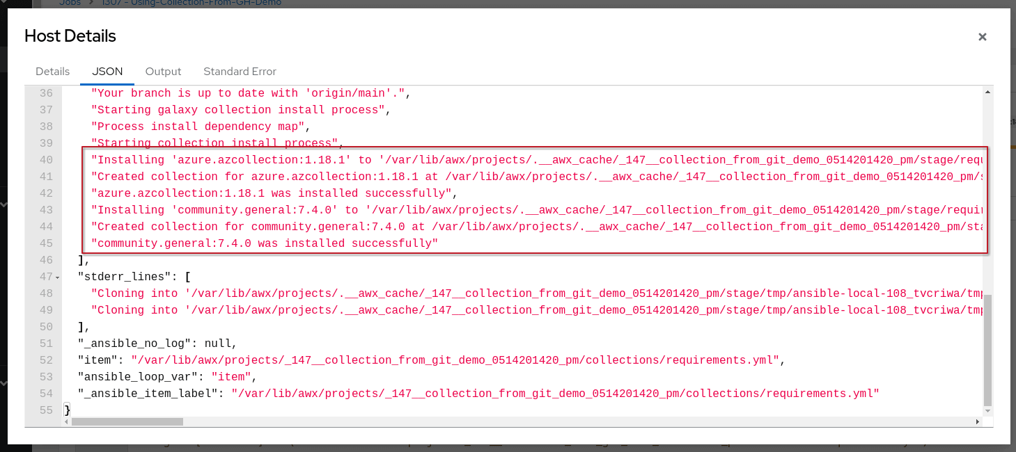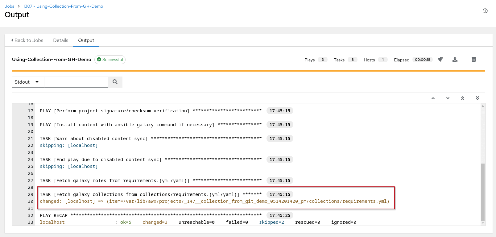 If you want to see the details, we can check the logs by clicking on the specific tasks; for example the task “Fetch galaxy collections from collections/requirements.(yml/yaml)” here. The logs clearly explain that the collections were successfully fetched from another repo (our collection repo) and installed into the project directory (on the Automation controller) successfully. See the screenshot below for reference.