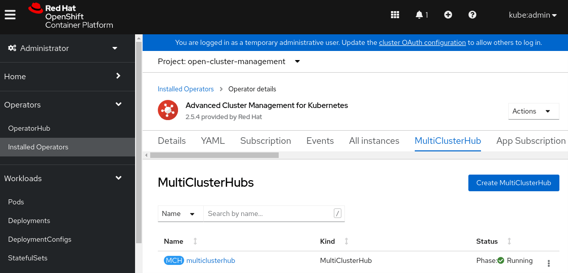 On the Create MulticlusterHub page, leave the default values, and click Create. You are redirected to the MultiClusterHubs tab.