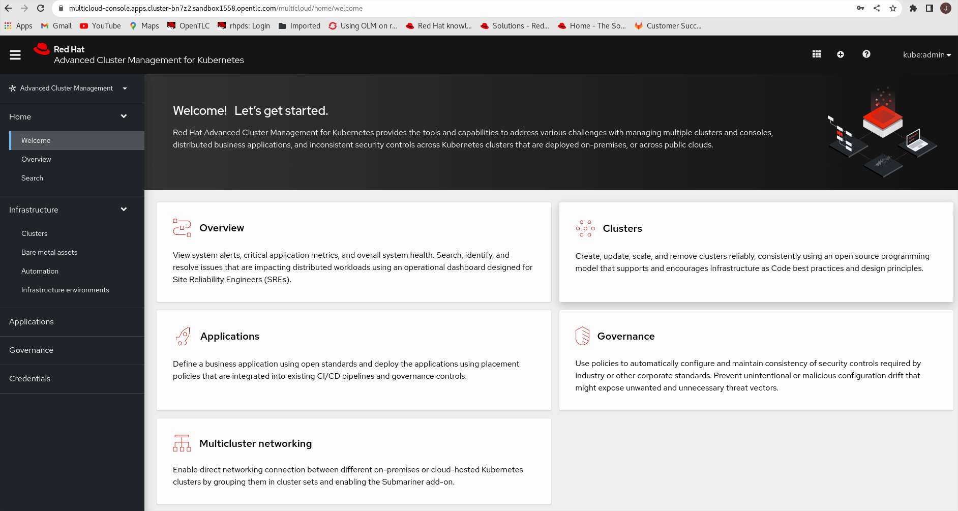 Open the RHACM web console at https://multicloud-console.apps.cluster-bn7z2.sandbox1558.opentlc.com with the hub “kubeadmin” credential.