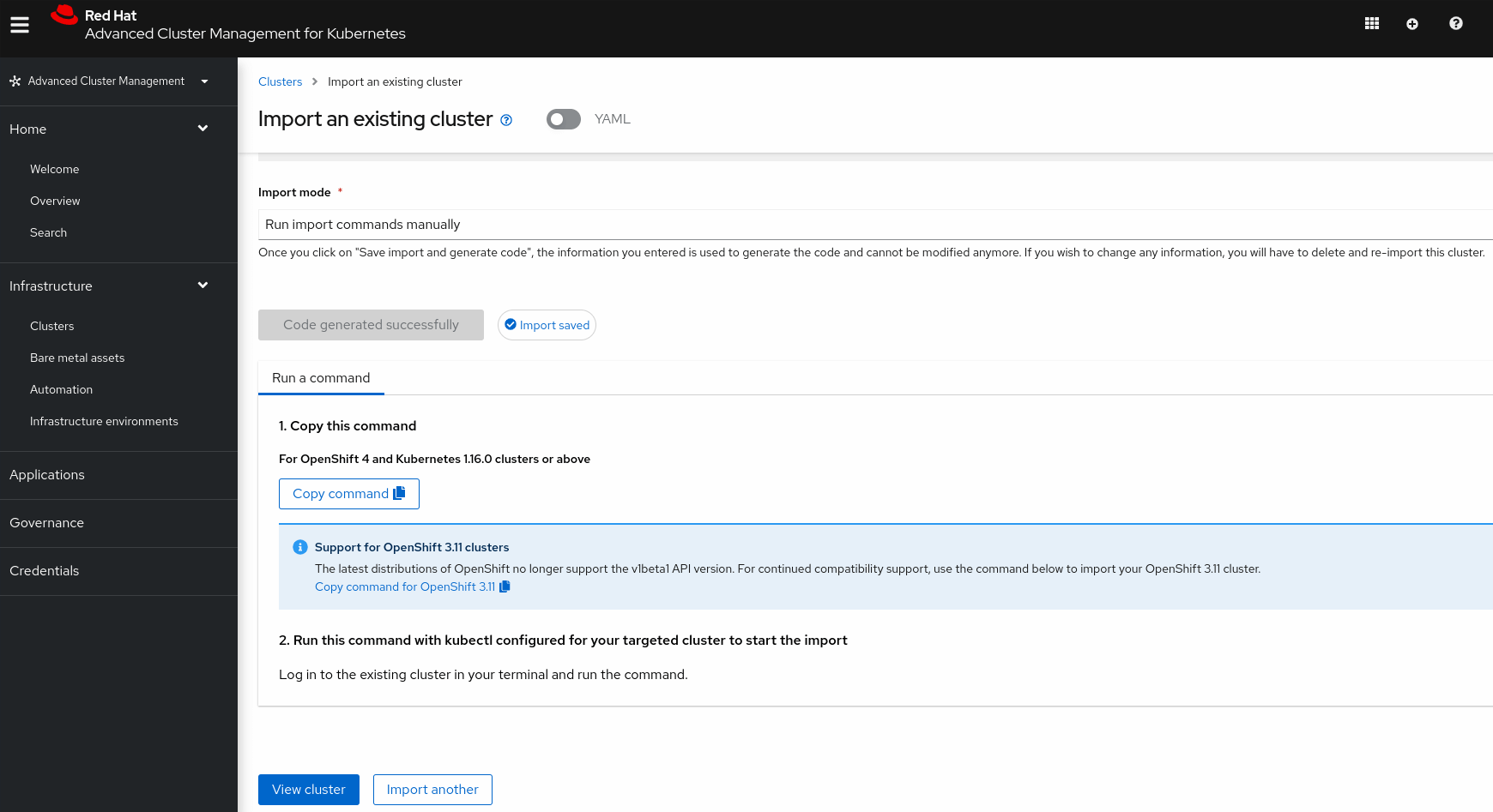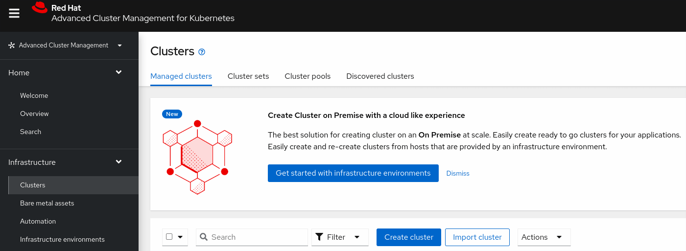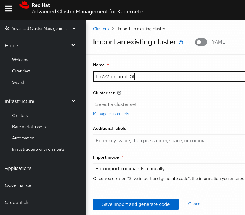 MultiClusterHubobject. - Import an existing cluster into RHACM.