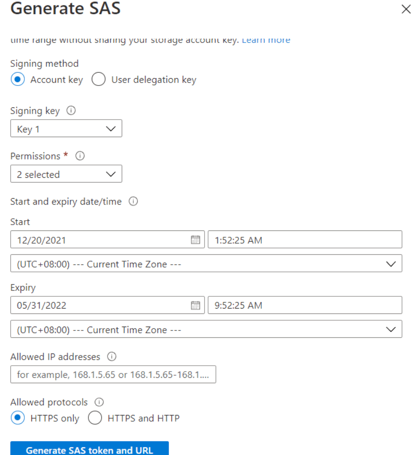 Important:6. Select the time zone for the token: UTC or your local time.The time zone of the token and your managed instance might mismatch. Ensure that the SAS token has the appropriate time validity, taking time zones into consideration. If possible, set the time zone to an earlier and later time of your planned migration window.