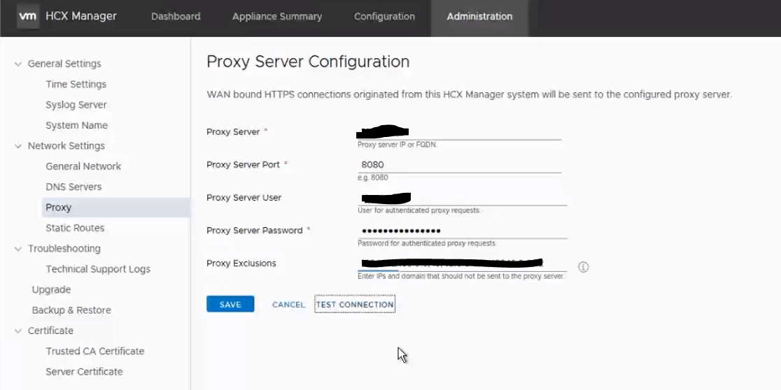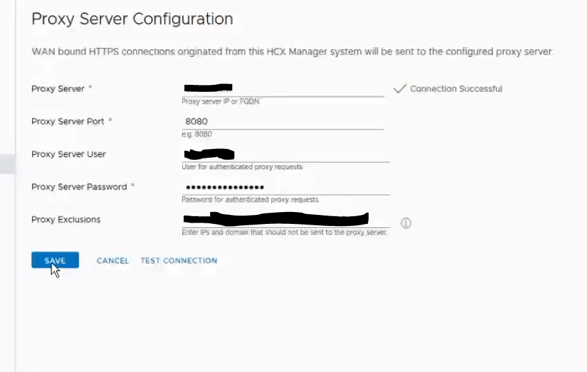 Enter your proxy information. Remember to exclude all local IP’s, vCenter IP’s. Before clicking save, click test connection button.