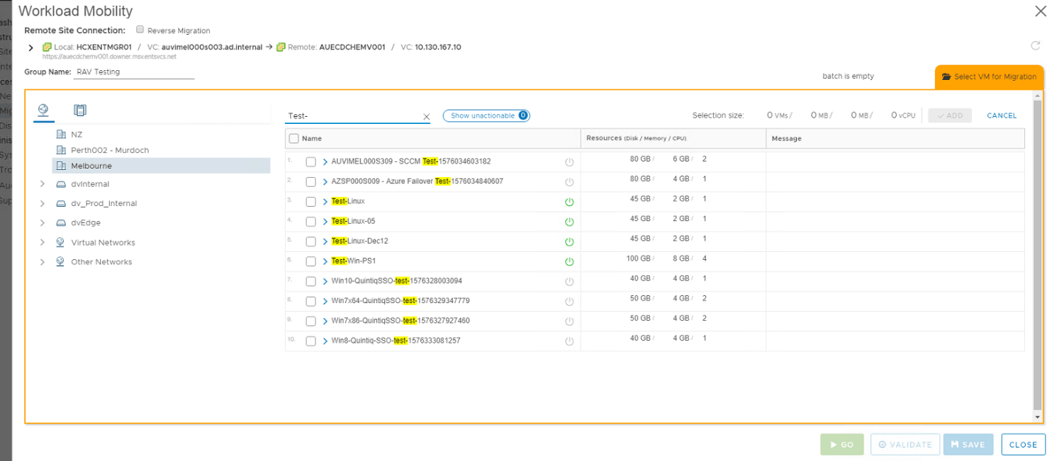 To initiate RAV job, select the target vCenter ( a.k.a remote vCenter ) from HCX Migration window first. Then search for the VM as shown in the picture below: